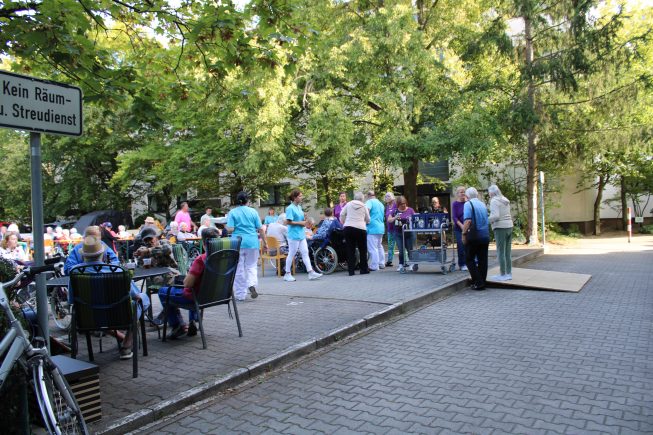 Unsere Bewohner und Angehörigen genossen in angenehmer Atmosphäre die Spezialitäten, die unser Küchenteam kreiert hatte, darunter verschiedene Salate, Lachsbrötchen, Würstchen und Steaks.